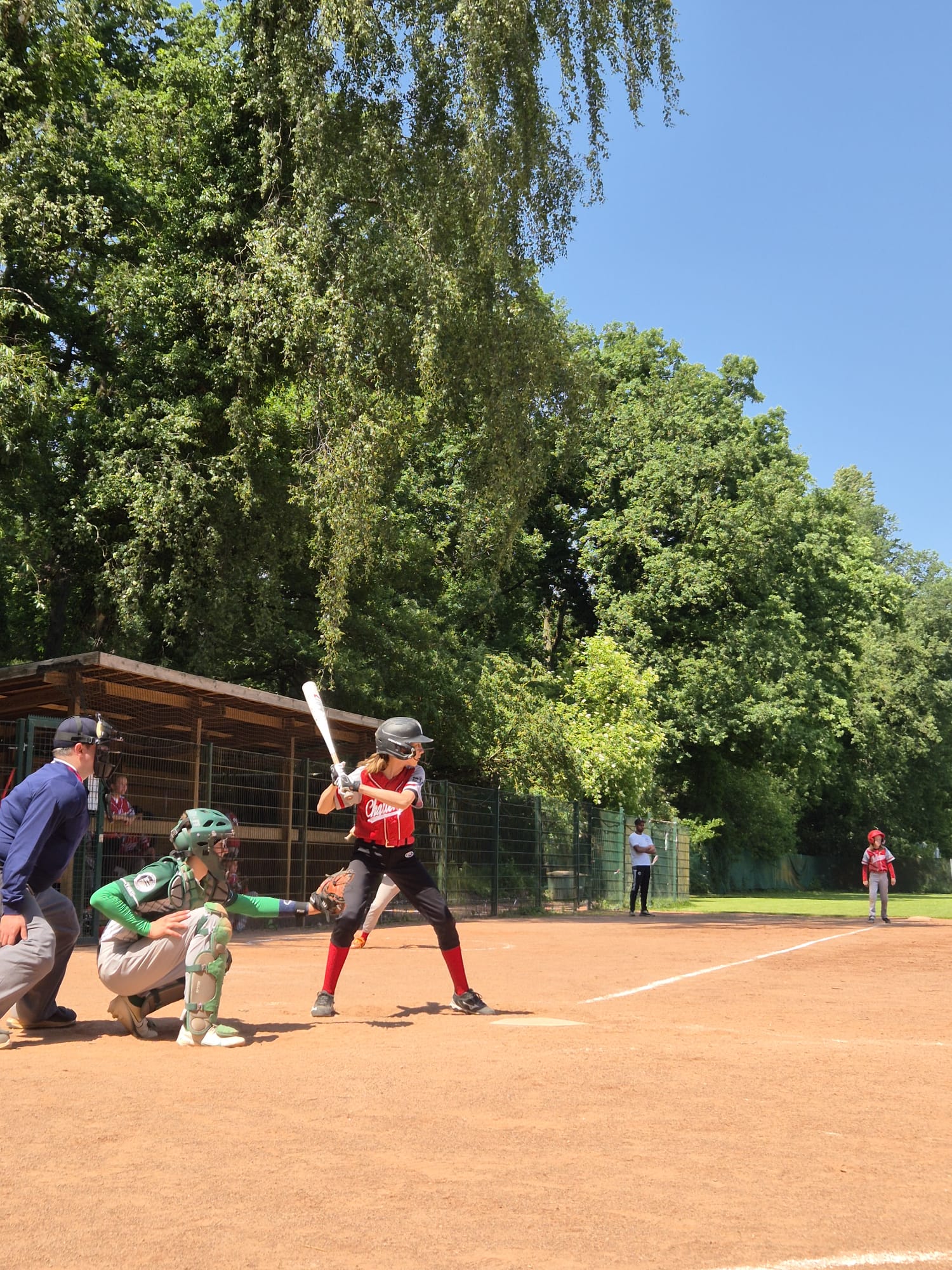 In den ersten 4 Innings des zweiten Spiels kam unsere Pitcherin Emilia Z. zum Einsatz, die eine souveräne Leistung zeigte und bei 26 Battern faced nur einen Walk und einen HP verteilte. Durch zu viele Fehler in der Verteidigung erzielten die Porcupines bereits im ersten Inning 6 Runs, welche unsererseits noch ausgeglichen werden konnten. Da sich in der Defence jedoch die Fehlerserie weiter fortsetzte und sich im Angriff nicht auf die zweite Pitcherin gut genug eingestellt werden konnte, mussten sich am Ende unsere Damen mit einem Endstand von 6:12 geschlagen geben.