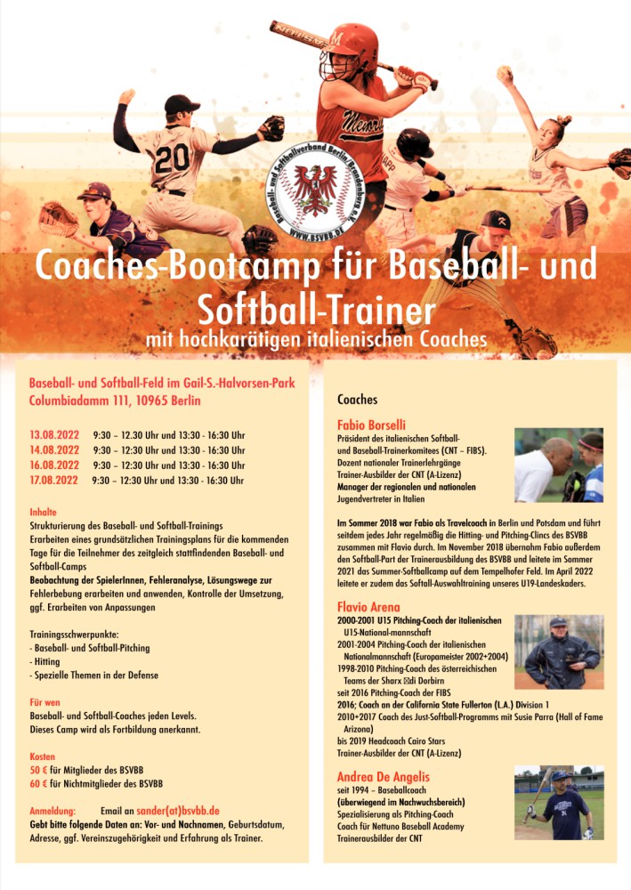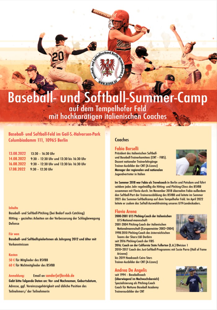 Der BSVBB veranstaltet dieses Jahr ein Baseball- und Softball Summer Camp mit den italienischen Coaches Fabio Borselli, Flavio Arena und Andrea De Anglis - drei sehr erfahrenen Trainern und Trainerausbildern der FIBS (italienisches Base- und Softballvereinigung). Zusätzlich wird es ein Coaches Camp für (angehende) Trainer geben (siehe Bild 2).
